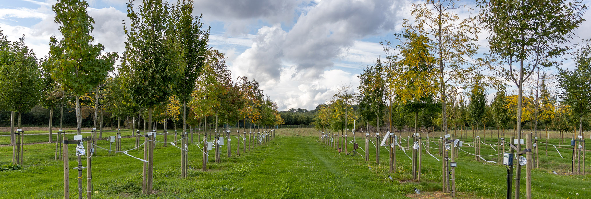 Three large, medium and slow-growing species are being tested: Quercus palustris (pin oak), Quercus cerris (Austrian oak), Tilia cordata ‘Greenspire‘ (small-leaved linden), Ostrya carpinifolia (European hop-hornbeam), Gleditsia triacanthos ‘Skyline‘ (honey locust), Liquidambar styraciflua (American sweetgum), Amelanchier lamarckii (juneberry), Carpinus betulus ‘Lucas‘ (common hornbeam Lucas), Koelreuteria paniculata (goldenrain tree).