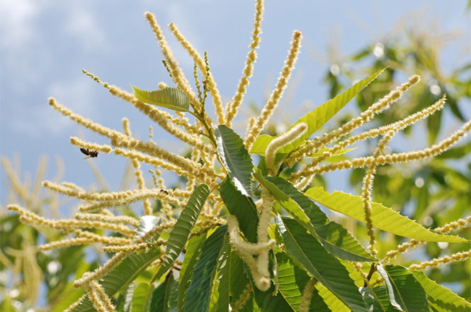 Honeybees collect intensively on the sweet chestnut, whose pollen is precious to bees. In addition to the nectar from the flowers of the sweet chestnut, the bees also collect honeydew on this tree. A nurturing tree at its finest!