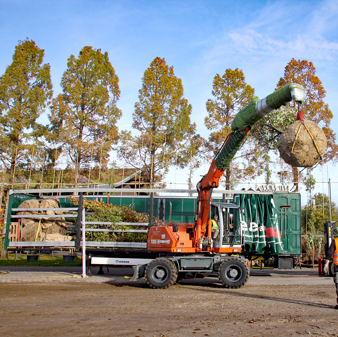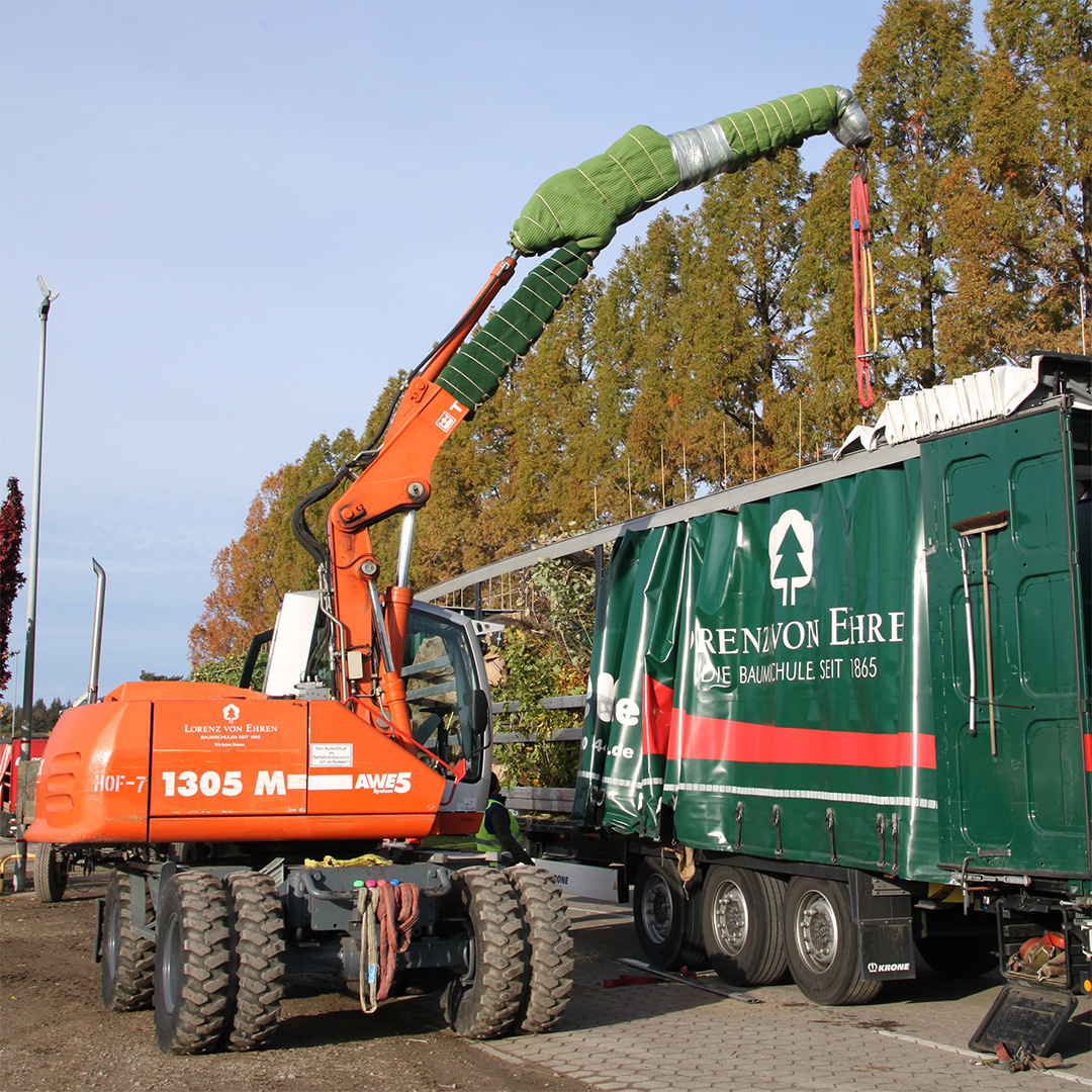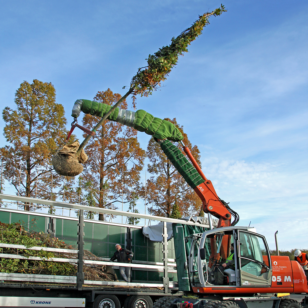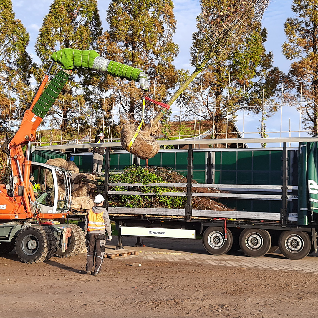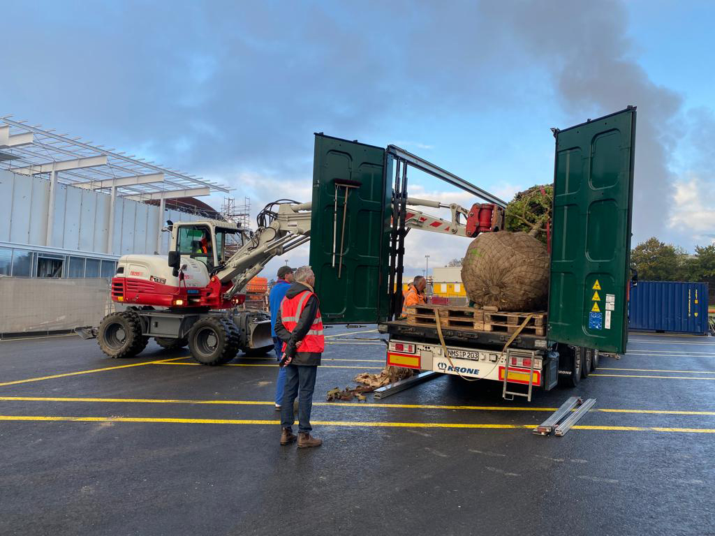 The first 14 trees from Lorenz von Ehren Tree Nursery will go on their journey on Nov 8th 2022. They include deciduous trees such as field maple (Acer campestre), hornbeam (Carpinus betulus), hop beech (Ostrya carpinifolia), wild cherry (Prunus avium 'Plena'), Turkey oak (Quercus cerris) and Swedish whitebeam (Sorbus 'Brouwers'). The trees are about seven meters tall, three to four meters wide, up to 24 years old and weigh around two tons.