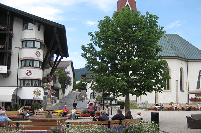 Von 78 auf 1000 Höhenmeter! Eine imposante Kastanie von neun Metern Höhe und 55 Jahre alt steht im Mittelpunkt des zentralen Platzes in Seefeld. Fast so, als stünde sie schon immer da. Verwendete Gehölze: Aesculus hippocastanum ‘Baumanii‘ – Gefülltblühende Kastanie - Privatgarten Kitzbühel: