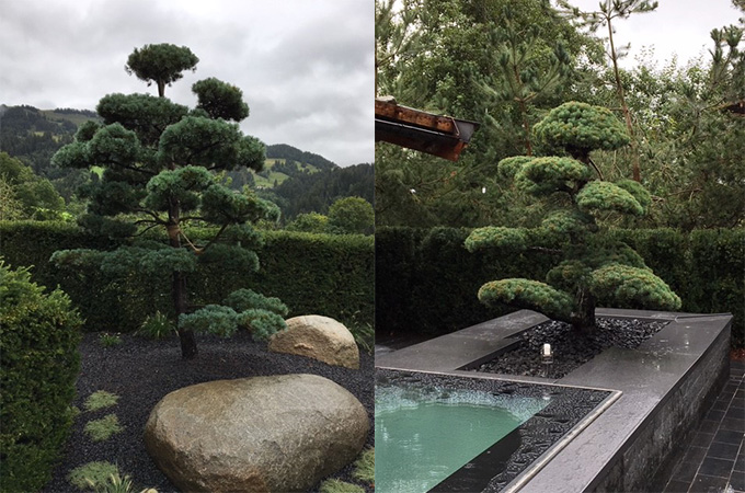 Asiatische Stilelemente prägen diesen Garten. Die zentralen Elemente sind die zwei beeindruckend elegante Bonsai-Kiefern. Verwendete Gehölze: Pinus sylvestris - Wald-Kiefer und Pinus parviflora - Mädchen-Kiefer - Esplanade, Bad Ischl: