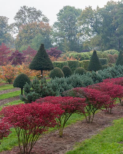„Mehrstämmige Bäume wurde bei der Aufzucht bereits in jungem Alter so geschnitten, dass direkt am Boden mehrere Stämme entstanden sind. Sie besitzen meist einen vasenförmigen Kronenaufbau: unten etwas schmaler und nach oben hin breiter“.